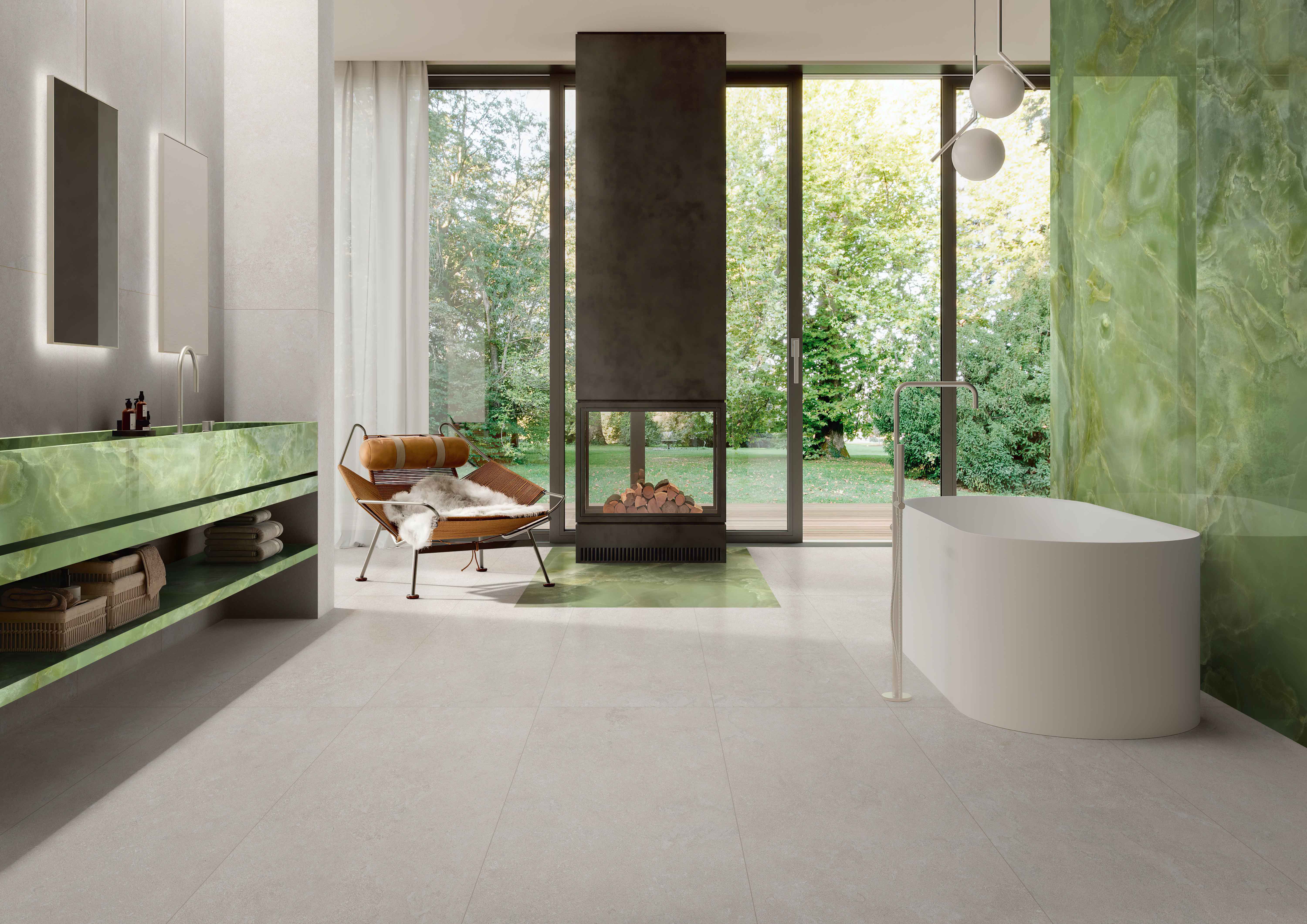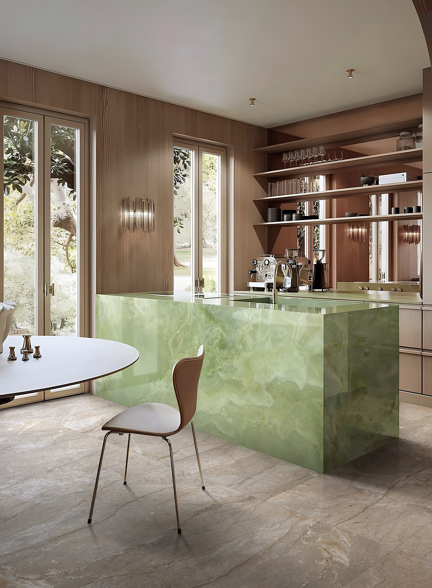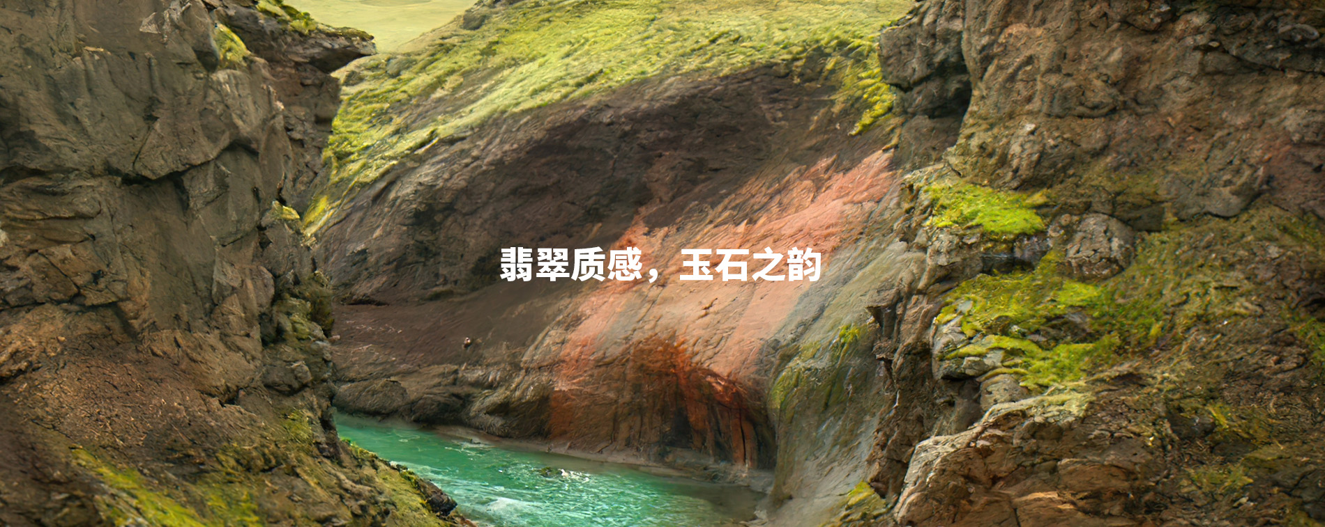 貝加爾青玉擁有翡翠般的獨特玉質,流紋、根紋、裂紋等玉石紋理層層交織其中,構筑成富有立體感與層次感的視覺效果,賦予空間豐富的意境又不失時尚格調。