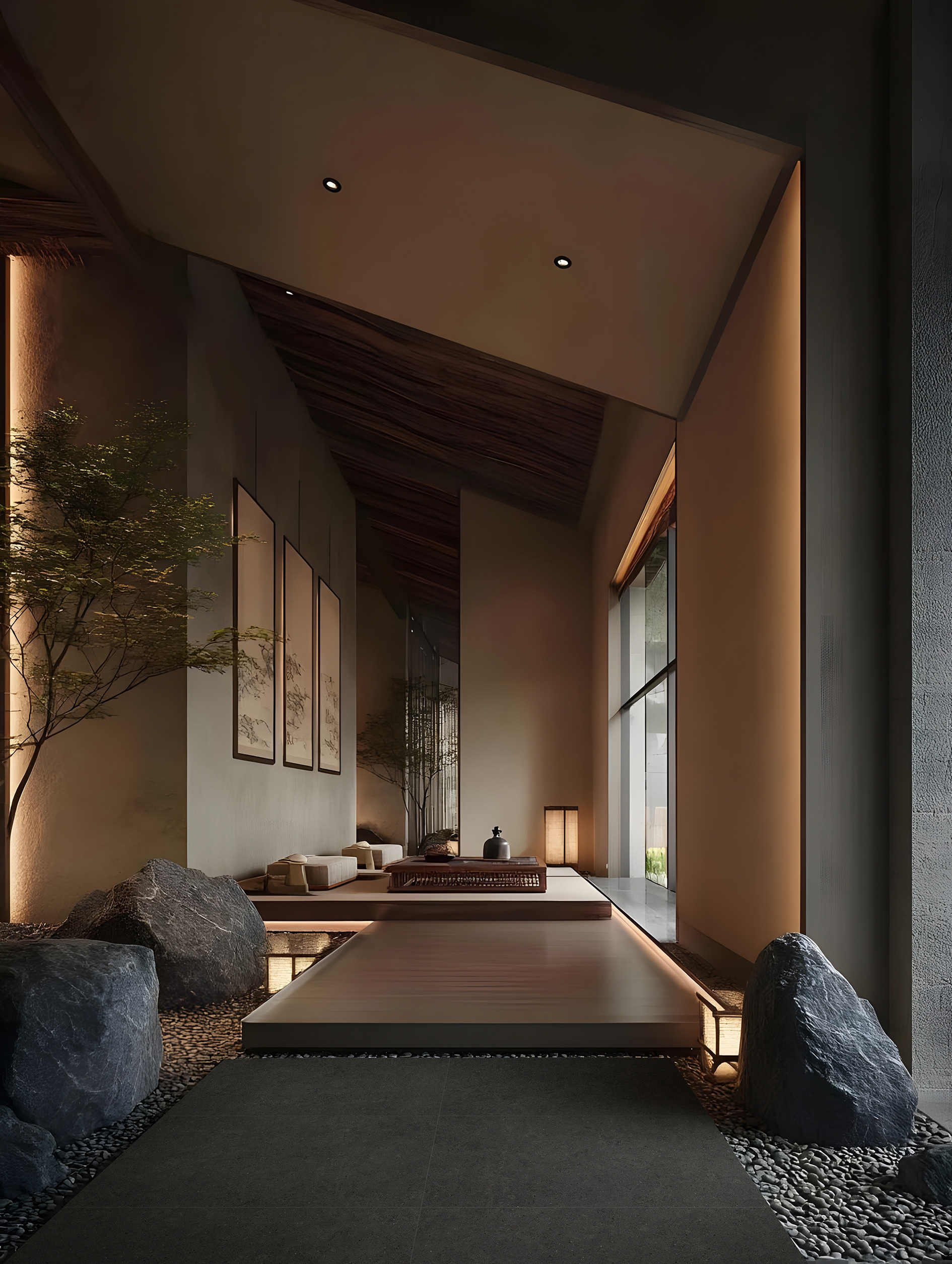 灰黑基底如潑墨蒼穹,淬煉出冷峻質(zhì)感,賦予空間暗夜星辰般的深邃張力。